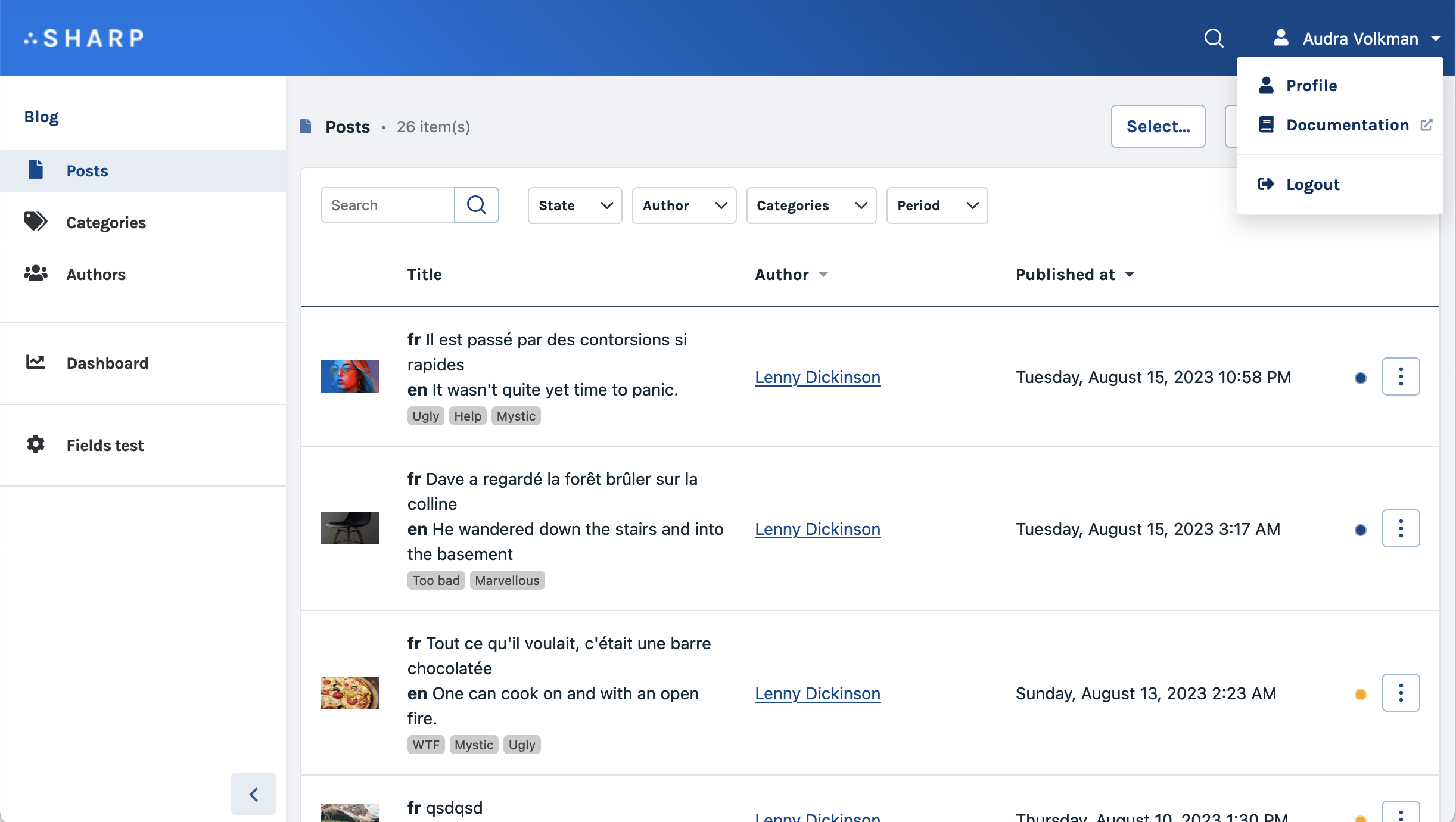 }In this example, "post" and "category" should be entities defined in the config file. Sharp will create a link either to the Entity List, to the Dashboard or to a single Show Page (depending on the entity configuration).